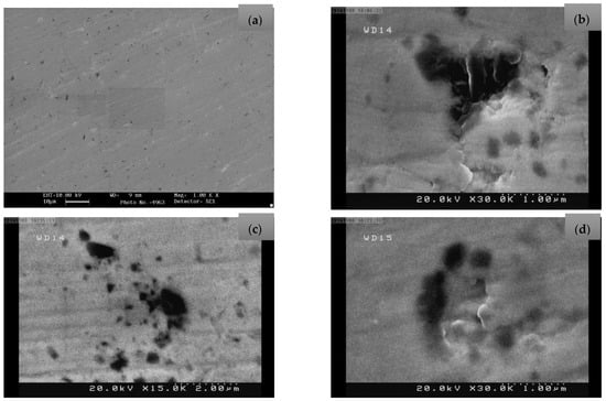 The corrosion potential of the implanted samples at doses of 1 × 1017 ions/cm2 increases, and this increase continues up to the 3 × 1017 ions/cm2 dose. It is worthwhile to use AFM image analysis to explain the cause of these effects. This behavior is due to an inadequate ion energy bombardment on the surfaces. This procedure results in the formation of cracks and pores in grain bounders. Therefore, by increasing the surface roughness in the grain boundaries, the tendency to corrode is increased when compared with other conditions. Additionally, the analysis results show that all implanted samples’ corrosion resistance has improved by argon ion implantation. SEM images are shown in Figure 3 in order to comparatively analyze the formation of thick corrosion products on the samples.