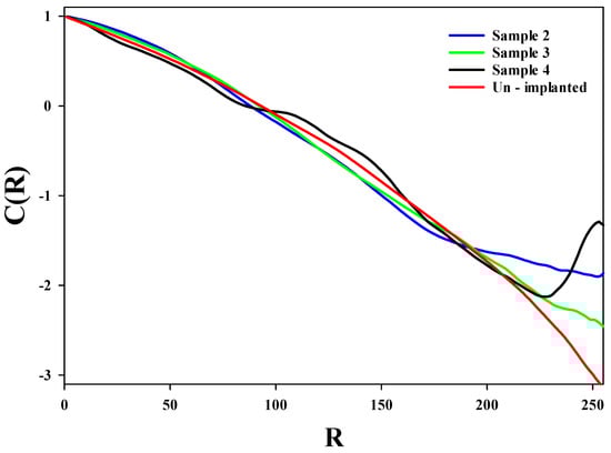 Through the rough surface growth, at first, the height of sites is not dependent on neighboring sites, in other words, the surface is uncorrelated. In all cases, the C(), reduces with an increase in separation distance. Figure 5 shows that the samples’ (both unimplanted and implanted) correlation lengths have minor differences up until around R of 225.