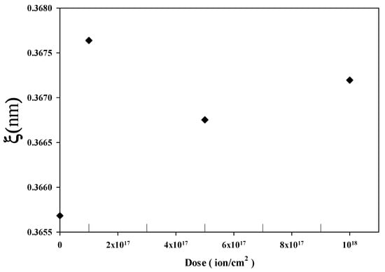The correlation lengths versus argon ion doses for unimplanted and implanted samples.