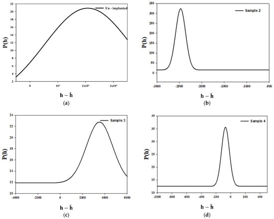 The normalized height distributions of (a) unimplanted sample, (b) implanted sample 2, (c) implanted sample 3 and (d) implanted sample 4.