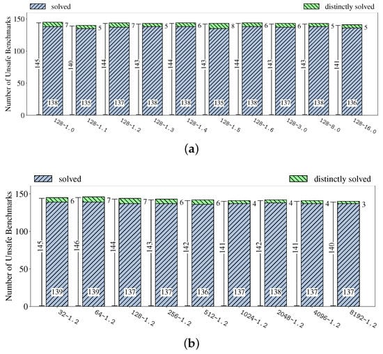 Number of unsafe benchmarks solved from the experiments. The category “distinctly solved” benchmarks are solved by CAR with the corresponding restart policy but not by the original CAR. The “solved” benchmarks solved by CAR with and without the restart policy. X-axis 128–1.0 means the initial , , and the same applies to others. (a) Results of the restart policy with the initial . (b) Results of the restart policy with .