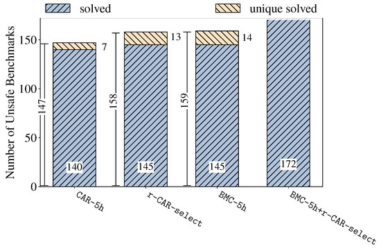 We combine the results from the five configurations (“64–1.2”, “128–1.2”, “128–1.5”, “128–3.0”, and “256–1.2”) of r-CAR with each configuration running for one hour, to represent running these five different parameter combinations in parallel, noted as r-CAR-select. Correspondingly, both CAR and BMC run for five hours. The BMC implementation in ABC finds 159 counterexamples in 5 h, CAR can find 147 counterexamples, and r-CAR-select can find 158 counterexamples. We can conclude that the restart policy is effective as it helps CAR find 11 more counterexamples than before (from 147 to 158). In addition, the performance of r-CAR-select is roughly equal to BMC (158 and 159), which is considered to be the most effective and widely used algorithm in bug-finding. To better compare the experiment result of r-CAR and BMC, we mark the number of counterexamples that cannot be found by the other side as “unique solved”. Similarly, the “unique solved” of “CAR-5h” in Figure 4 represent the number of counterexamples that cannot be found by BMC. As we can see, r-CAR-select finds 13 counterexamples that cannot be found by BMC, much more than before (CAR finds 7), which affirms our claim that the restart policy plays a non-negligible role as a part of the portfolio to check property violation or bug-finding.