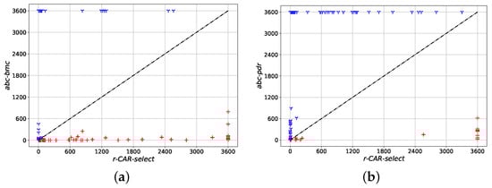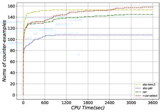 To evaluate the performance of r-CAR from another angle, we compare the time spent in solving each case between r-CAR vs. BMC and r-CAR vs. IC3/PDR, the results of which are shown in Figure 5a,b, respectively. The X-axis of these two figures is the time spent for the best result from r-CAR-select, while the Y-axis represents the time spent for BMC (resp. IC3/PDR) to solve the problem. Obviously, each point above the diagonal represents a single case in which BMC (or IC3/PDR) spends more time to find a counterexample than r-CAR-select and vice versa. It should be noted that points with the abscissa or ordinate of 3600 represent the instances that the corresponding method cannot find this counterexample in 3600 s. In Figure 5a, we can find that for those instances that can be solved by both algorithms, either BMC or r-CAR can solve most of them in a short time (less than 600 s). Even though BMC performs better in the instances that can be solved by both algorithms, r-CAR uniquely solved several instances that BMC could not solve. These two methods complement each other very well in bug-finding. Meanwhile, from the results shown in Figure 5b, r-CAR-select succeeds in solving many more instances than IC3/PDR within 3600 s and also solves them much faster. Obviously, r-CAR outperforms IC3/PDR in bug-finding.
