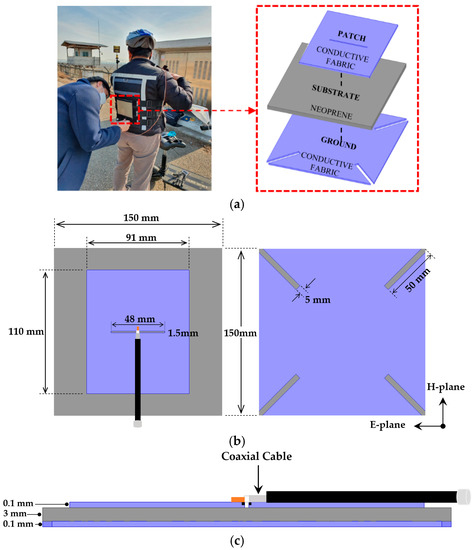 Geometry of proposed wearable antenna with cable placement (a) left: textile antenna embed on vest/right: perspective view; (b) top and bottom view; (c) side view.