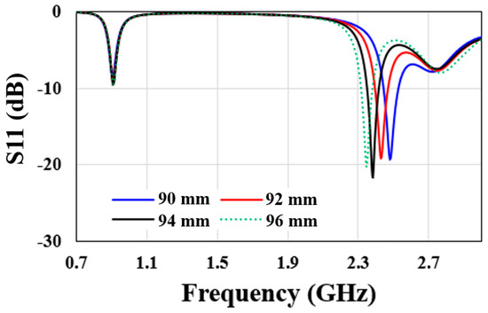 The dual-frequency performance is introduced by optimizing the sizes of the patch and the slot, for the lower 868 MHz and higher 2.4 GHz bands, respectively. Based on the simulations, the optimal antenna dimensions for the radiating patch were found to be 110 mm × 91 mm on a 150 mm square ground. More specifically, the longer side of the patch, which is vertical to the excitation slot, has an approximate half-wavelength of 868 MHz, λg (868 MHz)/2 ≈ 110 mm, and the length of the slot is close to a half-wavelength of 2.4 GHz, λg (2.4 GHz)/2 ≈ 48 mm. As the 2.4 GHz resonance is dependent on the relative position of the middle slot and width of the patch, the optimized size of the radiator is much smaller compared with the ground size needed for the 868 MHz resonance.