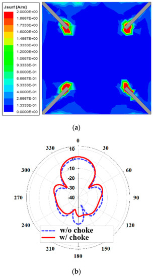 Effects of introducing diagonal choke points in the antenna ground: (a) simulated surface current density on the ground; (b) simulated E-plane radiation pattern with and without the choke.