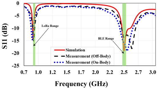 The S11 of the fabricated antenna was measured using a vector network analyzer (Anritsu MS2038C). Figure 6 shows the S11 result for the simulated and measured antenna model. The measured results are shown for when the antenna is integrated into a jacket (on-body) and when it is not (off-body). Figure 1a shows the on-body measurement scenario. As can be observed, there is good agreement between the simulated and measured results. The off-body measured S11 is on average 1.5 dB lower than the simulated value due to material losses and possible fabrication errors. The off-body measured S11 < −10 dB bandwidth is 32 MHz (854–886 MHz) for the lower band and 250 MHz (2.4–2.65 GHz) for the higher band, broad enough to cover the LoRa and BLE frequency spectrums, respectively. The on-body S11 < −10 dB was observed at 825–868 (43 MHz) and 2.37–2.6 GHz (230 MHz) for LoRa and BLE respectively. The on-body measurement shows a slight shift in the frequency at both bands with a 20 MHz reduction in the bandwidth at BLE. Although this may be due to the interference of the body on the antenna, the results remain largely unchanged as the antenna operates within the LoRa (863–870 MHz) and BLE (2.40–2.48 GHz) bandwidths. In addition, the position of the aperture feeding section, which is a source of interference for most wearable antennas, was placed far from the body and may have been an advantage in ensuring minimal body interference.