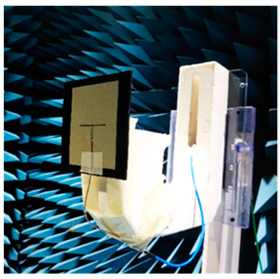The prepared conductive fabric and neoprene substrate were then tailored to precise dimensions using a sub-millimetre accurate textile cutting tool (Cricut Maker®). Double-sided adhesive tape was used to attach the conductive fabrics onto the neoprene substrate. They were pressed and heated to ensure secure bonding. It should be noted that the final dimensions of pre-cut fabrics were slightly larger to give room for cutting errors. This was dependent on the cutting machine used which had an error margin of ±0.5 mm for neoprene and ±0.1 for the conductive fabric. The adhesive film may have influenced the initial trials of the prototype and may have been corrected by incorporating its performance shifts in the simulation model of the conducting fabric. The proper adjustments were thus made to accommodate these errors after several prototype trials. Figure 5 shows the fabricated antenna with a zoomed-in picture of the antenna feed. The inner conductor of the coaxial cable is attached to the upper section of the aperture slot using conductive epoxy. Similarly, the outer conductor is attached below the slot, emulating a line source across the slot. It is important to note that the conductive epoxy required about 24 h to be fully cured. For best practices, a non-conductive thread was used to clasp the inner conductor across the slot. The fabricated antenna including the feed cable weighs 98 g. Aside from the proprietary printed fabrics [16], all other materials used such as neoprene, conductive epoxy, and coaxial cable are commercially available and can be inexpensively obtained.