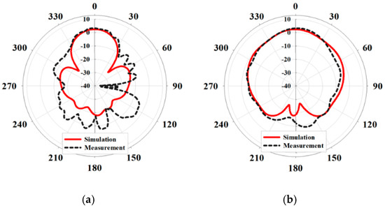 Measured and simulated antenna radiation patterns at 2.44 GHz: (a) E-plane; (b) H-plane.