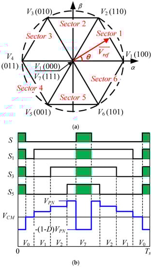 - Janabi, A.; Wang, B. Hybrid SVPWM scheme to minimize the common-mode voltage frequency and amplitude in voltage source inverter drives. IEEE Trans. Power Electron. 2019, 34, 1595–1610. [Google Scholar] [CrossRef]