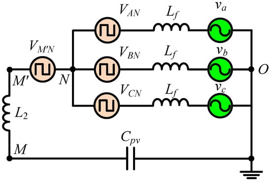 The common-mode loop model of the three-phase MAqZSI PV system is shown in Figure 5. The voltage between nodes M and M’ is the inductor L2 voltage. Moreover, the CMV VCM is the total voltage of the VON and VNM. From Figure 5, VCM may be expressed as