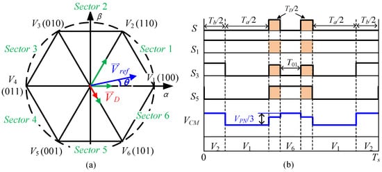 In the proposed CMV-SVM reduction method for MA-qZSI, Sector 1 is taken as an example, as shown in Figure 6b. In this case, the proposed CMV-SVM executes with the sequence V2–V1–V6–V1–V2 with a commutation step of 60°. It can be seen that the proposed CMV-SVM reduction method for the MAqZSI in the non-ST state was operated as the conventional NS-SVM method, and one vector was used to replace . Furthermore, the time interval of was defined as T6 = Tz. Then, the variation of the CMV was reduced to one-third of the DC-link voltage.