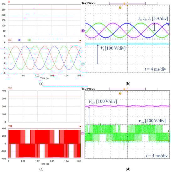 MAqZSI under the proposed CMV-SVM reduction method when Vi = 250 V, D = 0.11. (a,c,e) Simulation results and (b,d,f) experimental results. From top to bottom: input voltage, output currents, capacitor C1 voltage, vab voltage, DC-link voltage, and CMV.