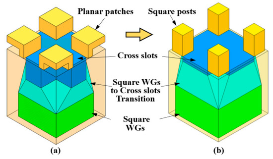 Figure 1a shows the configuration of the proposed dual-polarization antenna element with a four-layer structure. On the top layer, four short-end patches, which are excited by the cross-slots on the second layer, are evenly distributed at the corners. On the third layer, a novel gradient transition structure is proposed to feed the cross-slots through a square WG. This structure is easily realized by 3D-printing technology. By comparison with the cavity-excited cross-slots in [15,22], the complexity of the proposed antenna is reduced. The fourth layer is the feeding square WG, which can easily connect with an orthomode transducer (OMT) and achieve the function of dual-polarization radiation. Furthermore, an improved dual-polarization unit is also studied, as shown in Figure 1b. The metal posts are used to replace the short-end patches. This simplified structure can effectively reduce the fabrication difficulty, especially for large-scale arrays.