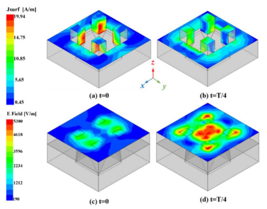 The electric magnetic simulation software ANSYS Electronics Desktop was utilized to reveal the operation principle of the proposed dual-polarization ME-dipole. Figure 2 displays the electric field and surface current distributions of the ME-dipole single unit. At t = 0, the surface current is strong at the side surfaces of the posts in Figure 2a. The surface current and E-field are weak at the top surface of the posts and the aperture between the posts in Figure 2c. It signifies that the equivalent magnetic dipole in the x-direction is excited. At t = T/4, the sinusoidal distribution of the surface current can be observed at the top surface of the posts in Figure 2b. The E-field is also strong over the aperture between the posts in Figure 2d, which indicates that the metal posts consist of equivalent electric dipoles in the y-direction. The electric dipole and magnetic dipole are excited alternatively, which forms the EM-dipole unit. The same distribution will appear on the orthogonal planes when another orthogonally polarized port is excited.