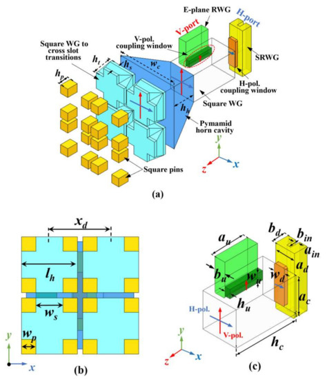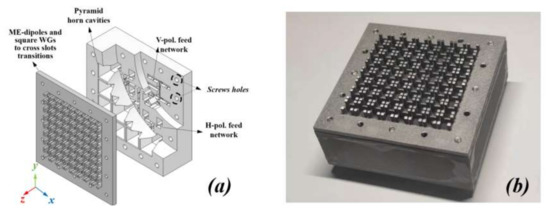Based on the proposed dual-polarization ME-dipole unit, the array layout of the design was carried out. In order to further simplify the structure of the total array, a horn cavity was employed to excite the 2 × 2-unit ME-dipoles, which formed a subarray. The geometry of the dual-polarization subarray is displayed in Figure 3. It can be divided into two parts: the radiation part and the feeding part. The four ME-dipoles with metal posts and cross-slots constitute the radiation part. The first layer of the feeding part comprises four square WGs to cross-slots transition structures. The pyramid horn cavity is laid on the second layer. It can not only reduce the complexity of the feed network for the total array but can also decrease the feed loss of the total array and expand the bandwidth of the array. In addition, by comparison with the step cavities in [23], the pyramid horn cavity is more conducive to the 3D-printing technology. The orthomode transducer composed of vertical square WGs and two orthogonal coupling windows is utilized to feed the radiation part with high isolation. The E-plane RWG and single-ridge WG (SRWG) are employed as two feeding transmission lines.