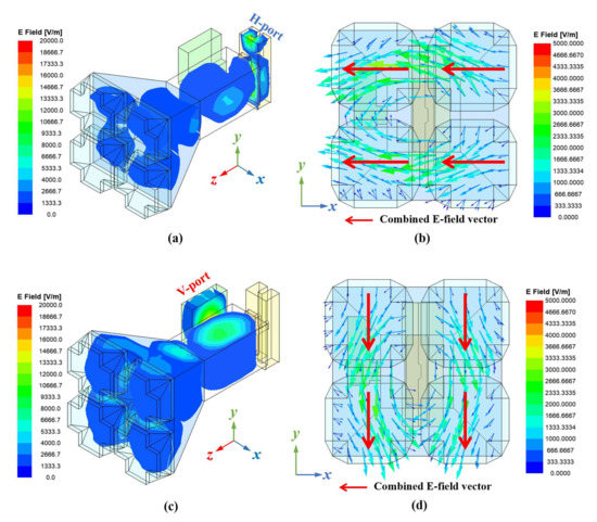 Figure 4a,b shows the distribution of electric fields in the subarray when fed by the H-pol. port. The quasi-TE10 mode in the SRWG is transmitted into the square WG through the H-pol. coupling window, and the TE01 mode is excited in the square WG. The E-field direction of the TE01 mode in the square WG is parallel with the V-pol. coupling window. The EM-wave from the H-port is cut off by the V-pol. coupling window. The two orthogonal coupling windows structure can attain high isolation between the two orthogonal polarization ports. The directions of the combined E-field over the four cross-slots’ apertures are along the x-direction, which form the H-pol. radiation. Figure 4c,b gives the distributions of electric fields in the subarray when fed by the V-pol. Port. The TE10 mode is excited in the square WG, and the direction of the combined E-field over the four cross-slots’ apertures is along the y-direction, which forms the V-pol. radiation.