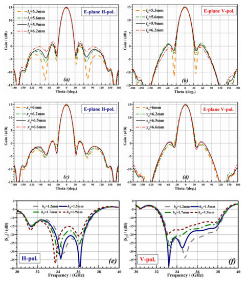 The working mechanism of the proposed dual-polarization ME-dipole unit is discussed in the previous section. Some key parameters are studied to guide the design of the dual-polarization antenna. According to the working mechanism of the ME-dipoles, the height of the posts hp, the length (lh) of the cross-slots and the width length ratio (ws /lh) are set to 0.25, 0.4 and 0.6, respectively. The distance between the adjacent ME-dipoles (xd) is set to 0.76 λ0. The height of the cross-slots is set to 0.1 λ0. The simulated gains of the subarray with different lh and xd values for H- and V-polarizations are shown in Figure 5a–d. It shows that the gains of the two polarization units increase with increasing lh. However, the sidelobe level also rises with increasing lh. Therefore, in consideration of the high gain and low sidelobe, the value of lh is set to 5.9 mm. Similarly, the subarray gain increases with increasing xd and reaches the highest when xd is equal to 6.5 mm. By tuning the two key parameters, a proper gain can be achieved. Additionally, the height of the transition (hs) affects the impedance-matching performance of the subarray notably. The reflection coefficients of the two ports for different hs values are shown in Figure 5e,f. The impedance-matching bandwidth of the H-pol. port increases when hs becomes smaller. However, the reflection coefficient of the V-pol. port will worsen when hs becomes smaller. Finally, the value of hs is set to 1.5 mm.