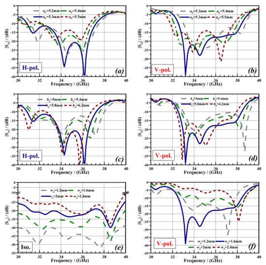 The width of the pyramid horn cavity, which is determined by the distance and the length of the cross-slots, is set to 11.8 mm. The H-pol. And V-pol. Coupling windows have the width of the square WG (ac) and the width of the ERWG (au), separately. The matching performance of the two feeding WGs is determined by the width of the square WG and the height of the pyramid horn cavity. The reflection coefficients of the two ports with different ac and hh values are shown in Figure 6a–d. It shows that the influence trend of those parameters on the two ports is opposite, so there is an optimal solution for both parameters. In addition, the isolation between the two orthogonal polarization ports with different wd values is shown in Figure 6e. It shows that the isolation rises with decreasing wd. Finally, the value of wd is set to 1.6 mm in consideration of the best impedance bandwidth performance, which is shown in Figure 6f. Following the above design guidelines, better radiation and feeding performance of the dual-polarization ME-dipole subarray can be achieved.
