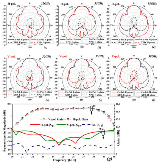Simulated performances of the dual-polarization ME-dipole subarray: (a–f) radiation patterns; (g) S-parameters and gain.