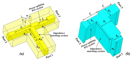 The unequal-power but equal-phase (UPEP) E-plane WG divider and the UPEP SRWG were employed to construct the feed networks. Figure 8a,b shows the geometry of the UPEP SRWG and UPEP E-plane WG divider, respectively. Three WGs sections were introduced into the two UPEP dividers as the impedance transformers. The power-splitting ratio between the output ports can be tuned by adjusting the parameters: narrow wall width (b2 and b3), ridge height (bi2 and bi3) and length of the two WG sections (l2 and l3). Based on this tuning method, the phase difference between the output ports can be controlled within a small range.
