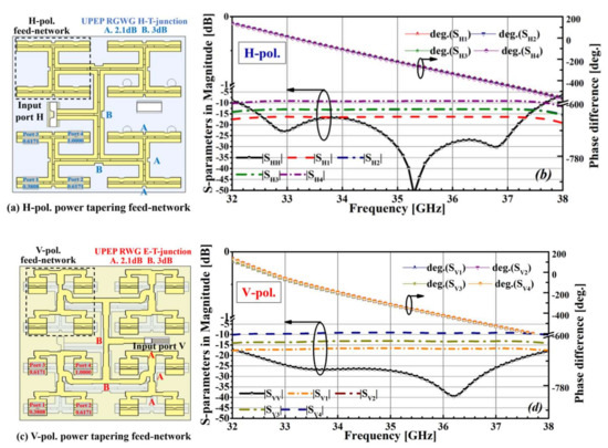 Configuration and simulated performance of the power-tapering feed networks: (a,b) H-pol. feed networks; (c,d) V-pol. feed networks.
