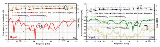 The S-parameter was measured by an Agilent E8361A Vector Network Analyzer. Radiation performance was evaluated by a near-field antenna measurement system at the Ka-band. The measured and simulated s-parameters and gains are plotted in Figure 11. The measured results agree well with the simulations. The measured reflection coefficients less than –10 dB bandwidth for the H-pol. and V-pol. ports are 14.3% (32.4–37.4 GHz) and 17.1% (32.4 –38.4 GHz), respectively. The isolation between the two polarization feed ports is better than 30 dB in the range of 32–38 GHz. The measured gains of the H-pol. array and V-pol. array are higher than 25.8 dBi and 26.1 dBi over the bandwidth of 31–39 GHz. The measured gain is lower than the simulated value by 0.4–0.7 dB. The main reason for the difference in gain comes from the surface roughness of the 3D-printing part. According to previous similar works [19,20,21], the inner surface roughness of the feed networks under the DMLS process used in this design is about 10 um. The loss caused by the surface roughness could be calculated in terms of the reduction of aluminum alloy electrical conductivity. Another simulation of the total array was performed by HFSS to verify the gain differences. The aluminum alloy conductivity in the simulation model is set to 1 × 107 S/m (original value is 3.2 × 107 S/m). The simulated gain vs. frequency curve of the 8 × 8-unit ME-dipole antenna array is also given in Figure 11. The results show that the loss caused by the surface roughness at 32–38 GHz can be estimated to be 0.3–0.5 dB. In addition, tolerances for fabrication and measurement can also cause a slight gain difference. The estimation method can be used in large-scale array design.