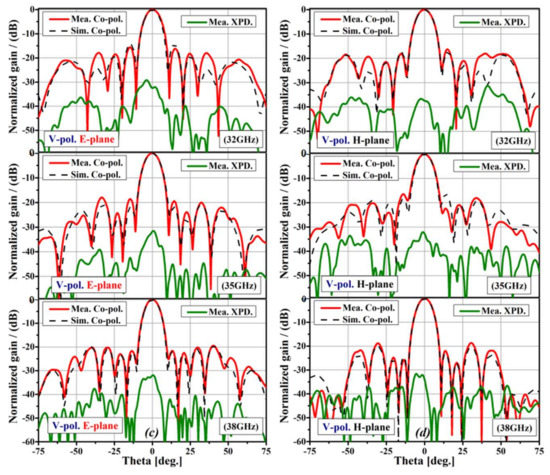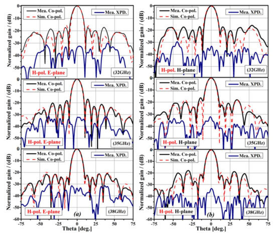 The measured radiation patterns in the E-plane and H-plane are shown in Figure 12. The measured first sidelobe levels of the two polarization arrays are less than –17.5 dB in both the E-plane and the H-plane, respectively. The cross-polarization levels are better than 32 dB for the two polarization arrays in both planes. The measured and the simulated radiation patterns are in good agreement, which verifies the effectiveness of the design.