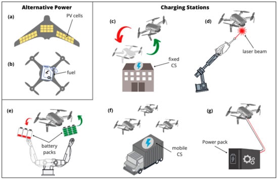Drone power management. (a) Solar-powered drones, suitable for fixed-wing UAVs. (b) Hybrid-powered drones, combining energy from electric and fuel cells. (c) Drone-swapping method, with a fixed charging station. (d) Laser-powered on-the-air recharging. (e) Battery hot-swapping, without powering down the drone. (f) Mobile recharging stations, with programmed charging scheduling, and (g) Tethered drones.