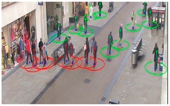 Tracking crowd movement can provide insight into potential risks caused by the crowd dynamics, such as the emergence of riots [] that can prove to be an essential tool in surveillance operations. Optical flow, an algorithm that estimates the motion of image intensities temporally in a video sequence [], has been used in motion estimation applications in the past. Whereas the high computation requirement of the optical flow method is now achievable using single board computers, real-time tracking application remains a challenge. Authors in [] argue that the traditional optical flow methods fail to perform since drone imagery that is often susceptible to change in viewing angles and perspective due to camera movements during flight. The authors have proposed increasing the efficiency and robustness of moving target tracking using optical flow by compensating the camera motion, removing the moving background and then segmenting the independently moving foreground blobs or other similar hindering means. In [], a different approach has been employed to perform tracking of the human crowd from the drone datasets. The authors have applied globally optimal greedy algorithms that have been first introduced in [] to estimate the tracks of multiple targets in the captured video sequence. In another work, the authors in [] have proposed a traverse order generation scheme to address periodical surveillance of multiple moving targets. The proposed scheme uses multiple drones in a decentralized manner. The scheme is designed in a way that can determine the sequence of tracked targets. All the targets are visited sequentially by predicting the position of the next target in path planning. As targets move from one area to another, the presented algorithm switch between drones. The proposed strategy provides an excellent opportunity for the crowd monitoring system to detect abnormal activities. It is worth mentioning that datasets tailored for tracking applications are pretty scarce, with the Visdrone [] dataset remaining the most extensive dataset tailored for multi-object tracking, apart from the smaller UAVDT dataset []. It has recently been utilized for the tracking of individuals in crowds not complying with the COVID-19 SOPs [] as shown in Figure 3.