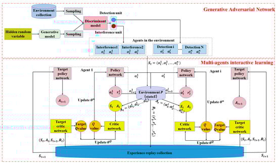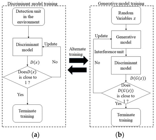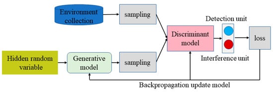 The generative adversarial network can be subdivided into two steps during the same round of gradient inversion: the discriminative model training first, followed by the generative model training. The training flow chart is shown in Figure 3. During the training of the discriminative model, the surrounding agents are classified to be 0 and 1, while the interference sources are corresponding to 0 and detection sources are corresponding to 1.