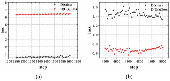 The training results of the generative adversarial network are shown in Figure 4. As can be seen in Figure 4a, there is no obvious confrontation process between the generative model and the discriminant model at the beginning of training when the number of training is 1300, and their loss values do not change significantly. As shown in Figure 4b, the loss values of the generative and discriminant models tend to stabilize as the number of training times increases. This indicates that the discriminant model can discriminate detection from interference in a simulation game adversarial environment. Generative adversarial networks can effectively improve the adversarial ability of an agent, with fast training, simple model, and high discriminant accuracy after training.