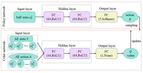 In Figure 6, the environment is interconnected and contains all agents. The policy network of each agent generates successive actions according to its own state in the environment, and the process is only related to the agent’s own state; thus, the policy network reflects the non-cooperative nature of the multi-agent. The critic network is based on the state and the of the generated action, and the state and the of the generated action of the other agents in the experience playback set, and then the evaluation value of the decision process of the policy network at moment t. Therefore, the critic network embodies the ability of multi-agent interactive learning.