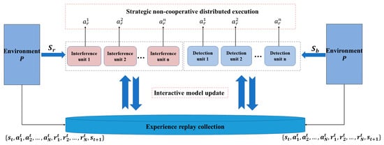 It has to be noticed that multi-agent interactive learning is a well-known characteristic of game evolution. In recent years, many scholars have introduced the idea of “game theory” into deep learning. For example, in the battlefield of cyberspace, an offense–defense evolutionary game model [] as well as an exploration–detection game model [], was established to constantly improve cognition and decision optimization by interactive learning, such as to enhance cyber defense capability. In terms of the communication battlefield, the establishment of a dynamic game model [], which allows intelligent jammers and intelligent anti-interference to be trained in interactive game confrontation, can effectively improve the intelligence of the multi-agent. In summary, it is obvious that combining game evolutionary with a multi-agent interactive learning framework can effectively improve the training effect. However, these studies did not introduce game strategies.