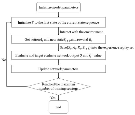 where is the strategy selection, denotes the state value function, is the expectation, is the discount factor, is the reward at moment , and is the state at moment . From Equation (1), it can be seen that the current state value is determined by the current reward and the next moment value, which is the basic form of Bellman’s equation. The Bellman equation is solved by iteration.