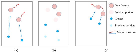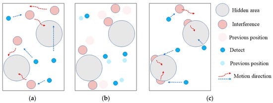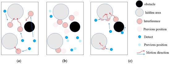 Diagram of the confrontation process in the multi-agent obstacle-covert confrontation environment: (a) detection agents’ action, (b) interference agents’ action, and (c) action process of the detection agent and the interference agent.