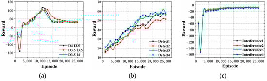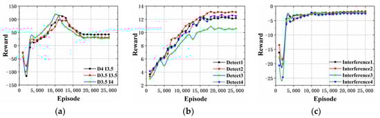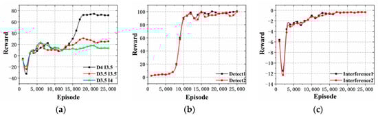 In Figure 11b,c, the blue detection agents and red interference agents evolve independently of each other in the interactive self-learning game and evolution and execute the non-cooperative distribution strategy. In addition, the reward function curves both finally reach the equilibrium steady state, further proving the strategy of non-cooperative equilibrium of the ISGE-NCE method.