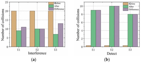 Comparison of the effect before and after multi-agent learning: (a) comparison of the effect before and after learning for the red interference multi-agent (orange represents the number of collisions before training, green represents the number of collisions after training, and purple represents the difference between the number of collisions before and after training); (b) comparison of the effect before and after learning for the blue detection multi-agent (orange represents the number of collisions before training, green represents the number of collisions after training, and purple represents the difference between the number of collisions before and after training).