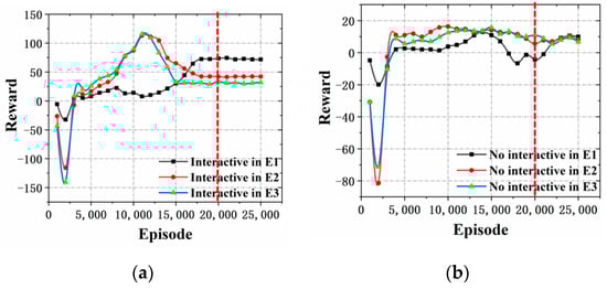 As shown in Figure 15, the reward function values of interactive self-learning and evolution are compared with those of non-interactive self-learning and evolution in the three experimental environments settings of 4.1, 4.2 and 4.3. When the number of training times is 20,000, it can be seen in Figure 15a that the reward function value of E1 is 71.8, the reward function value of E2 is 42.3, and the reward function value of E3 is 32.4, while the reward function curves are close to equilibrium stability in the three experimental environments. The reduced learning time and the faster stabilization of the algorithm are attributed to the interactive learning ability of the critic network. In Figure 15b, the reward function values of E1 are 9.9, E2 are 8.2, and E3 are 6.8, while the reward function curves in the three experimental environments are obviously not converged; thus, it can be concluded that the ISGE-NCE can effectively improve the evolutionary ability and convergence.