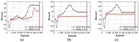 Comparison chart of the reward functions of the ISGE-NCE method-DDPG learning method: (a) comparison chart of the reward functions of the experimental environment (E1) in Section 4.1; (b) comparison chart of the reward functions of the experimental environment (E2) in Section 4.2; (c) comparison chart of the reward functions of the experimental environment (E3) in Section 4.3.
