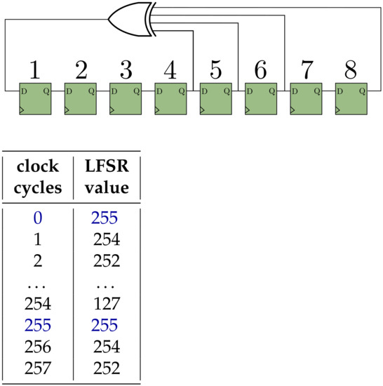 8-bit LFSR circuit with a primitive polynomial configuration equal to (184 in binary notation). Every cycles, the sequence is repeated periodically, starting from the seed value (blue color).