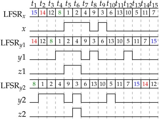 Suppose two BSs are generated from two independent LFSRs with the same polynomial but having different seeds. Suppose these two BSs are multiplied. The question that arises is: does any different couple of seeds generate the same result? If not, how does the seeding affect the overall outcome? Take for instance the operation shown in Figure 3. The x signal represents the value , while y represents . The same LFSR polynomial is used to generate each signal but with different seeds. Two versions of y ( and ) are generated for comparison purposes. For the , we picked the next value in the sequence of the (see with the seed highlighted in red) as the seed. For , we picked the fourth value in the sequence of the (see with the seed highlighted in green). As seen, due to the fact that the LFSRs have the same polynomial, the stream is a shifted version of . This makes the x signal 1’s match the and 1’s in different times, producing different outcomes in the final operation. In order to see the impact of seeding, the AND operation between x and is presented in , respectively. For the case of , the result is , whereas for , the result is . As shown, represents more accurately the ideal value (), with an absolute error of . This fact shows that is less correlated than , respect to x. This short and simple example demonstrates how seeding has an impact on the overall results in SC correlation sensitive circuits (as is the case of multiplication), so careful selection of seeds must be carried out to obtain the most accurate results.