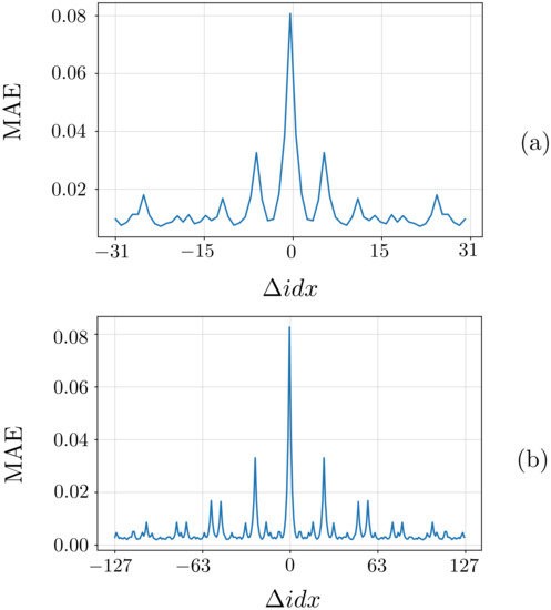 Expanding the preceding example, Figure 4 shows the Mean Absolute Error (MAE) for different seeds when x and y are multiplied considering all possible values. Once again, the same polynomial is employed for the two LFSRs. Two different bit resolutions are taken into account in the analysis: 6-bit and 8-bit. Instead of performing the analysis by taking as reference the seed values as in the previous example, this time we took the difference between the seed position (seed index) in the sequence . Taking Figure 3 as an example, x is generated with the seed index 0, is generated with the seed index 1, and is generated with the seed index 3. In essence, the seed index corresponds to the value taken by the LFSR sequence at time . Formally, the MAE for every seed index is calculated as:
