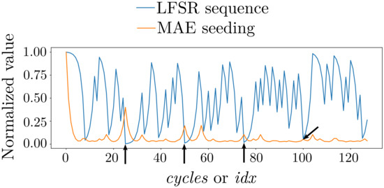 It is worth noting that as we move away from , some seed indexes present an error resonant behaviour (high peaks in the plots); however, as we move closer to the further index, the peaks are mitigated in an exponential way. The reason for this phenomenon can be better understood by observing Figure 5. The blue line shows the normalized value of the 8-bit LFSR sequence for the first 127 cycles. The orange, in turn, shows the MAE for the first 127 seed indexes. Since both variables share the same axis (), we can plot them in the same figure. As shown, the LFSR sequence presents similar patterns periodically (see arrows in the plot). Considering that the LFSRx seed is at , if the LFSRy seed coincides with one of these initial-pattern values, then a resonant error occurs, indicating that both sequences (the one starting with seed index 0 and the one starting with the initial-pattern) have a high degree of correlation, i.e., they are similar. Therefore, if noncorrelated operations are to take place (as is the case of the multiplication), it is mandatory to avoid these seed values for the generation of the second BS.