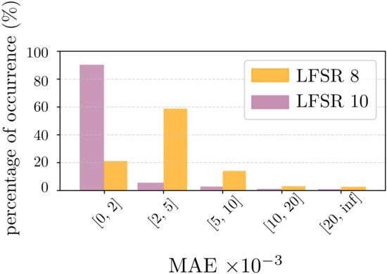 MAE histogram for the 8-bit and 10-bit LFSR examples.