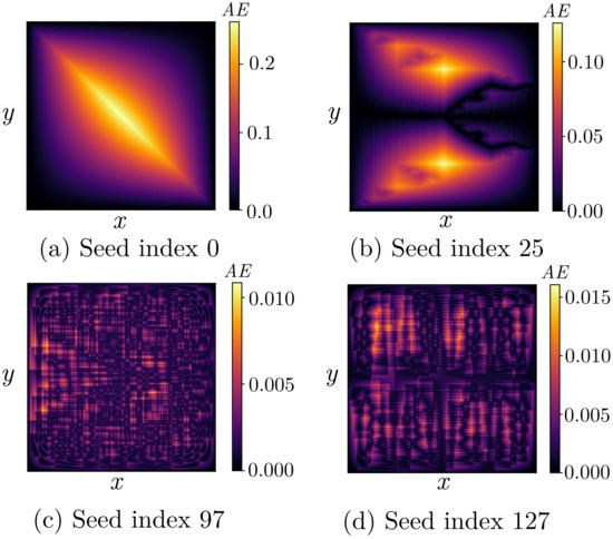Absolute Error (AE) in the multiplication when varying (from 0 to 1) using different seeds in the 8-bit LFSR example. Seed index = 0, which is the worst case, is shown in (a). Seed index = 25, which is one of the resonant error peaks, is shown in (b). Seed index = 97, which is the best case, is shown in (c). Furthermore, seed index = 127, which is the further seed index is shown in (d).