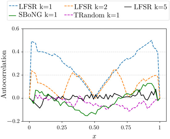 Let us see firstly how the LFSR behaves compared to other RNG found in the literature using an autocorrelation metric. F. Neugebauer et al. [19] define an autocorrelation metric based on the Box-Jenkins function [31], which is employed in the NIST Engineering Statistics Handbook [32]. The definition they provide is as follows: Let x be a BS with a sequence: , where N is the BS length, and let be the expected value of x. The autocorrelation of x will be:
