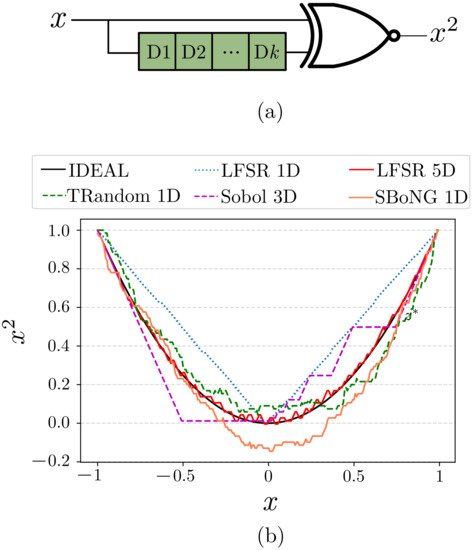 For comparison purposes, we evaluated an important operation in SC, namely, that of the Stochastic Quadratic Function (SQF). Its use is extended to very interesting applications such as the implementation of the SC-Gaussian function employed by V. Canals [34] for describing the probability density of a continuous random variable. Additionally, it has recently been used by J. Li et al. in the normalization block circuit for a SC neural network implementation [35]. We evaluated this function circuit, as an example, in an effort to see the effect of correctly isolating the BS generated by the LFSR and compare it with other RNG approaches. The SQF is built by a multiplication gate (AND gate for unipolar coding and XNOR for bipolar coding), and an isolation block to uncorrelate the input signal with itself, as shown in Figure 9a.