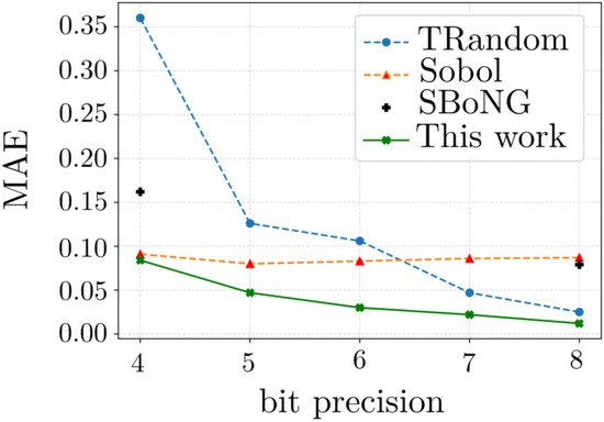 Figure 10 shows the best outcomes of each method. As seen, the Sobol method barely changed its MAE for different bit widths. When TRandom became better than Sobol, approaching LFSR performance. Therefore, if accuracy is the main requirement of our application, the LFSR remains the best option if we analyze the data for a complete BS period.