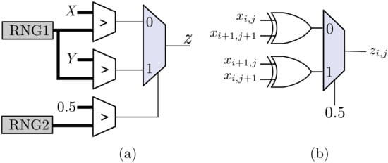 - Alaghi, A.; Li, C.; Hayes, J.P. Stochastic circuits for real-time image-processing applications. In Proceedings of the 50th Annual Design Automation Conference on-DAC ’13, Austin, TX, USA, 29 May–7 June 2013; ACM Press: New York, NY, USA, 2013; p. 1. [Google Scholar]